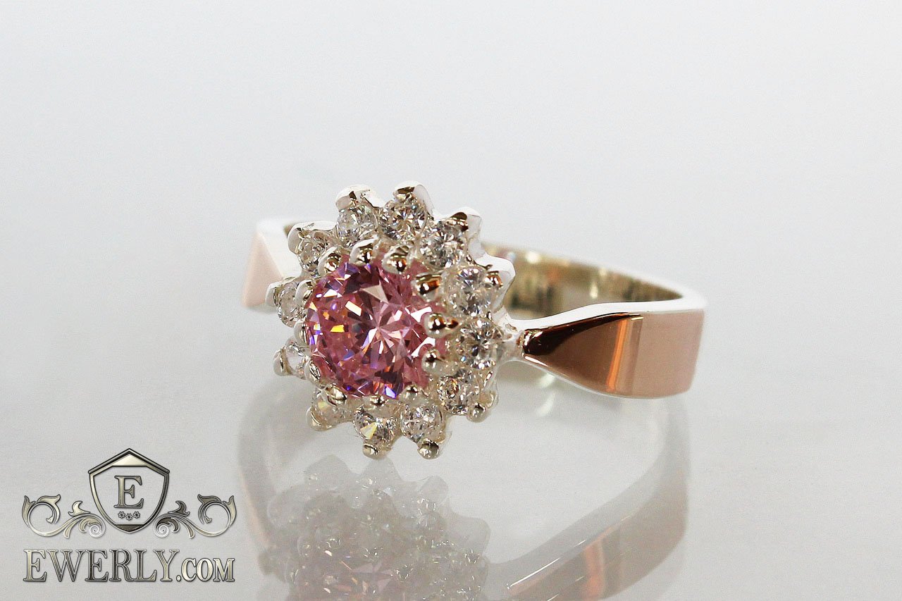 Женское серебряное кольцо с золотыми вставками и розовым фианитом в центре
