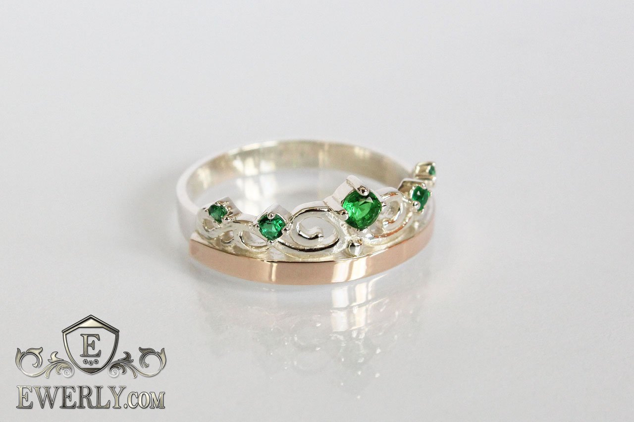 Кольцо «Корона» из серебра с золотом и зелёными фианитами