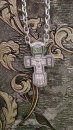 Крест обрамляет молитва. Это слова из Канона Кресту Господню: «Кресте всесильне, апостолов похвала, преподобных утверждение и верных знамение, иерархов и мучеников слава, победа и утверждение всех хвалящих тя. Кресте Честный, хранитель души и тела буди ми, образом своим бесы низлагая, враги отгоняя, страсти упражняя, и благословение даруя ми, и жизнь и силу, содействием Святаго Духа, и честными Пречистыя мольбами».